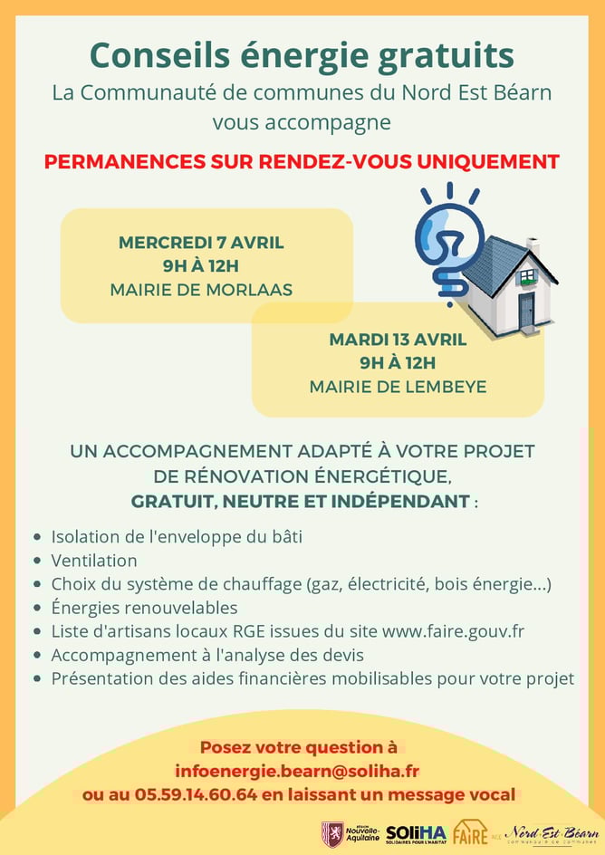 Dans le cadre d’un partenariat avec l’association SOLIHA Pyrénées Béarn Bigorre, deux permanences (UNIQUEMENT sur rendez-vous) de l’Espace FAIRE (anciennement Espace Info Energie) auront lieu, durant le mois d'avril :